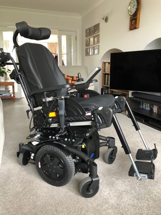 The power chair has ‘tilt in space’ and ‘rise and recline’ functions, and also attendant controls. It was built to MNDA specifications, and it was readily available. Evidently it had been ordered for another client who sadly didn’t live long enough to take delivery.